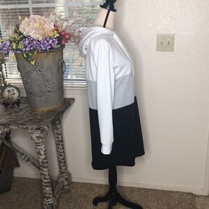 Cute and cozy sweatshirt dress in a shift design. Fleece lined and hooded to keep you toasty. There is a shadowy spot on one sleeve cuff, otherwise in excellent condition. Width at bust 20”. Waist 18.5”. Hip 19.5”. Sleeve 22”. Length 32.5”.