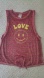 Red with Yellow design that includes the word Love and a Smiley Face. Distressed Vintage Look with Faded Coloring and Visible Stitching.
