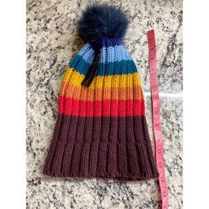 Stay warm and stylish with this vibrant multicolor knit beanie. The faux fur pom adds a trendy touch, while the ribbed design ensures a snug and cozy fit.