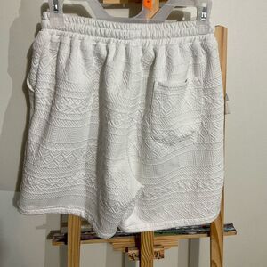 No Brand, these are very sleek with the crisp white look has a drawstring and pockets. Nice pattern on shorts, this is used but in good condition.