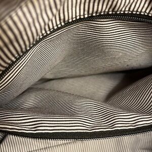No Brand red bow purse. Black, tan, white, gray and beige design. Straps detach.