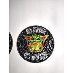 Add some intergalactic fun to your home bar with this set of two Baby Yoda drink coasters featuring a glittery design. These round coasters are made from cork, diamond painting, and acrylic materials, ensuring they are durable and slip-proof. Measuring 3.75 inches in width, they are the perfect size for any occasion and can be stacked for easy storage. The Star Wars-themed coasters are perfect for all occasions and will add a touch of space age style to your kitchen, dining, and bar area. They are a great gift for any Star Wars fan and are designed with a multicolor pattern that will complement any home decor. Get your hands on these coasters today and enjoy your favorite drinks in style!