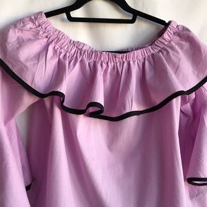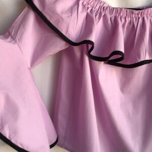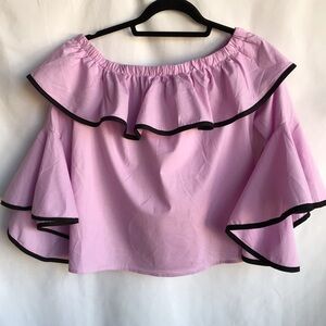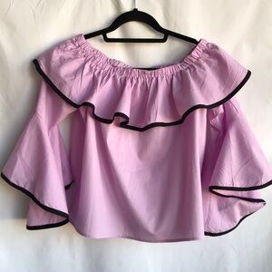 No Comment NT LA pink ruffle off-the-shoulder (or on) crop top with black trim, size L. New with tag. Super cute oversize sleeves.