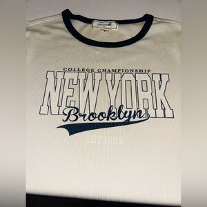 Beige tee with navy blue lining. Simple and trendy design. Women’s medium