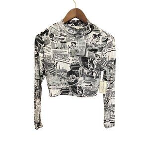No Comment NY.LA Large Womens Long Sleeve Newspaper Print Cropped Turtleneck Top