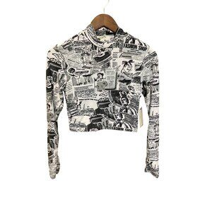 No Comment NY.LA Medium Womens Long Sleeve Newspaper Print Cropped Turtleneck To