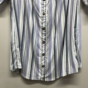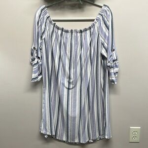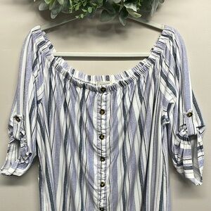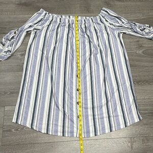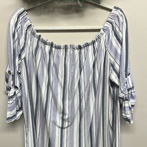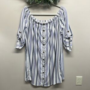 No Comment Plus Striped Off The Shoulder Knit Shirt Dress in size 3X. Great new condition, has never been worn. Faux button down front, 3/4 sleeves with rolled button and tabs. Please see photos for approximate measurements and details. Item may show difference in color based upon photography and perception. Photos are part of the description, as everyone’s level of condition may vary. From smoke free and pet free home. All packages are shipped the same or next business day.