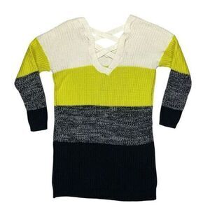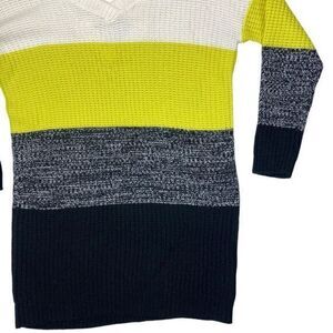 - Description: No Comment V Neck Sweater Dress Women L Color Block Modern Y2K Casual Knit Comfy