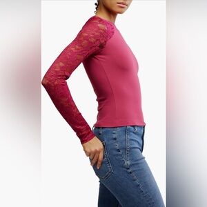Lace sleeves elegantly frame this svelte jersey top that brings the perfect mix of sporty romance to any look you pair it with.
