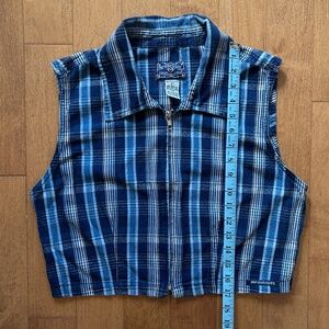 No Excuses plaid denim zip up sleeveless top! It is listed as a size large, but I'd say it fits more like a small or medium. I wear a small and I'm wearing it in the first photograph. It's so cute and has no flaws.