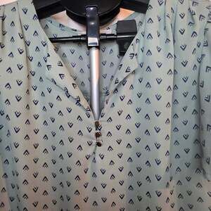 Lightweight No Frills Los Angeles blouse in a dusty mint green with a blue geometric pattern. This short-sleeve top features a V-neck, subtle gathering at the shoulders, and a relaxed fit. Made from 100% polyester, it's comfortable and easy to wear for everyday casual or dressed-up occasions. Excellent pre-owned condition, no visible flaws.