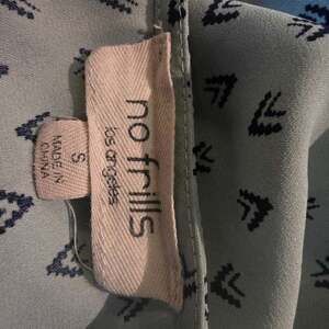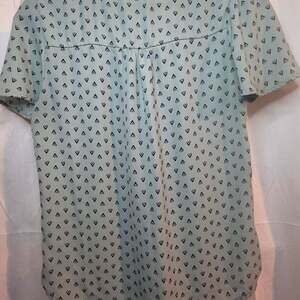 Lightweight No Frills Los Angeles blouse in a dusty mint green with a blue geometric pattern. This short-sleeve top features a V-neck, subtle gathering at the shoulders, and a relaxed fit. Made from 100% polyester, it's comfortable and easy to wear for everyday casual or dressed-up occasions. Excellent pre-owned condition, no visible flaws.