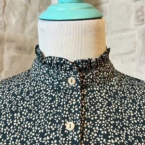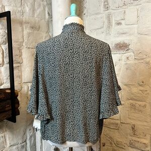 Beautiful, high neck, ruffle blouse. Discernment is lightweight and has fully functional buttons down the front. It also features a large batwing sleeves with ruffles on the edges.