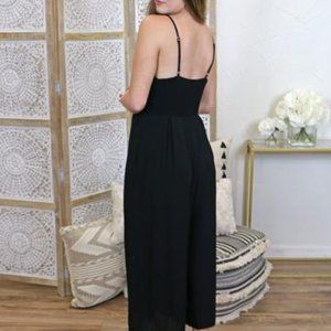 Jumpsuit features adjustable straps, smocked backing, front zip and button closure, side pockets