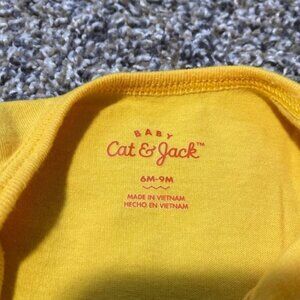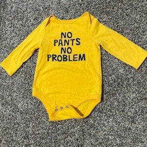 Yellow cotton onesie by Cat & Jack, has blue writing “no pants no problem”. Size 6-9 months. Excellent condition and comfy material!