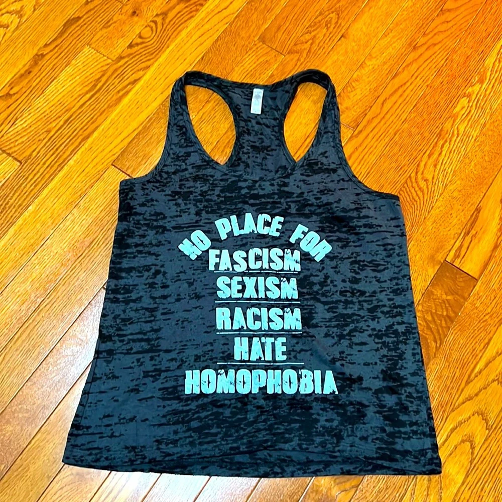 No Place for Facism, Sexism, Racism, Hate, Homophobia tank top. Burnout racerback fitted style, size XL. Worn and washed about once, excellent condition.