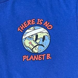 Royal blue shirt with left breast design, sick globe “There is no Planet B.”