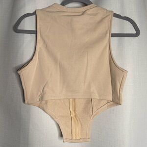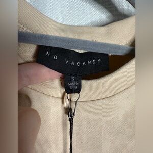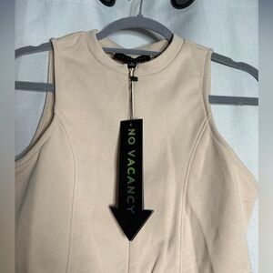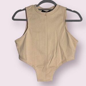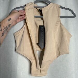 Brand New With Tags. No Vacancy Neutral Tan Crop Top. Sleeveless crop with a high neckline and a front zipper closure. It features structured seam detailing for a contoured fit, corset like fit but is made from a soft cotton blend. Size Small.