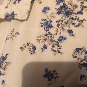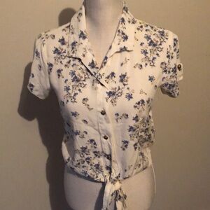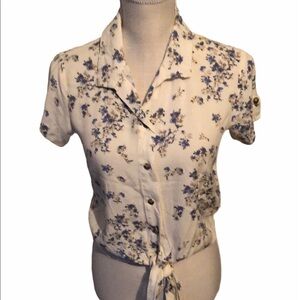 No boundaries button up crop top that ties at waist. Shirt sleeves with tab. Elastic back . White with small clusters of blue flowers. Nwot. XS