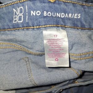 No boundaries size 17 Hi-rise jeans medium wash side to side measurements is 19" rise is 12" inseam is 27.5 " top of waist to bottom hem is 40" if you have any questions please message me bundle more items for bigger deals Bin-119