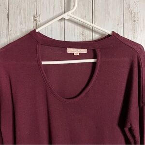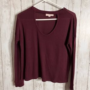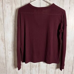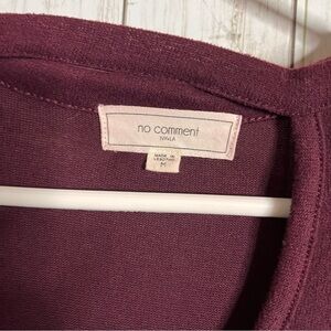 No comment long sleeve medium burgundy sweater. 68% polyester, 28% rayon 4% spandex. Machine wash cold gentle cycle. Tumble dry low.