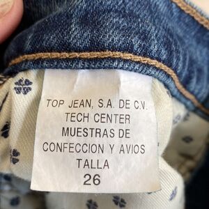 No label faded denim pockets zipper button inseam length 27 inches stretch