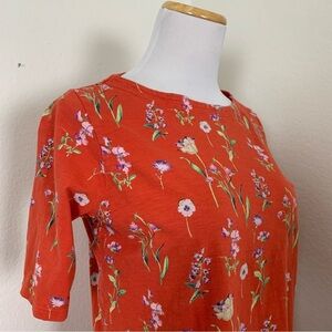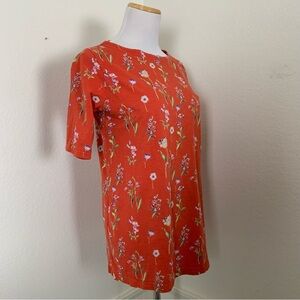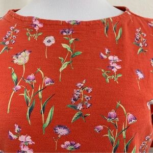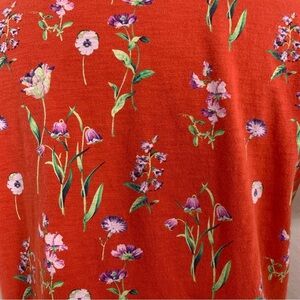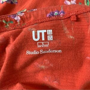 Uniqlo UT Studio Sanderson Floral Print Top.   Women’s size small. Orange/Red. 100% Cotton. Good preowned condition. Free of rips, holes or stains. Measured flat. Armpit to Armpit is 18”, shoulder to bottom hem is 26”.