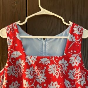 No tag sleeveless red dress with blue floral design. Size Medium