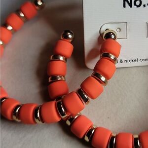 Stylish orange beaded hoop earrings with gold accents. Perfect for adding a pop of color to any outfit.