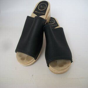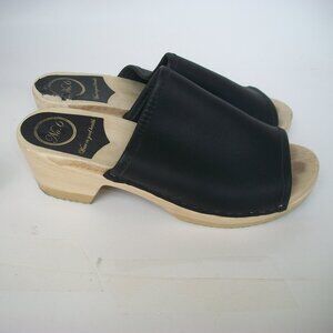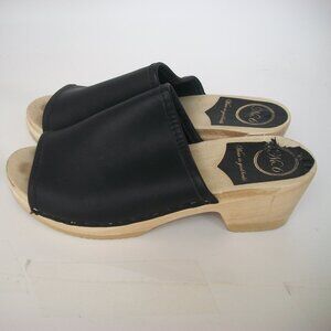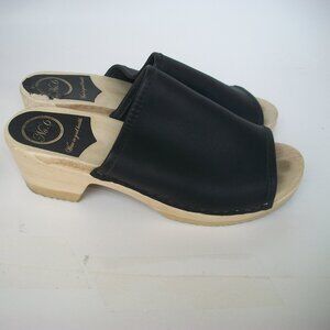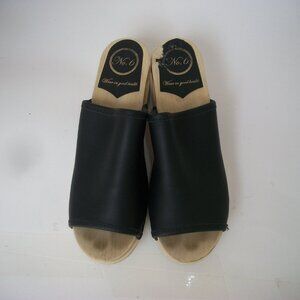 A pair of No.6 Store handmade black leather mid-height-heel [2.25"] open-toe clog-mules with rubber reinforced wood clog-bottom& heels. Marked 40 which No.6 Store's chart says is a US 10.. Heel 2.25" Insole 10" Width 3.25" Wear includes wear at rear of left shoe and wear on the leather pad on insole of left shoe. Moderate wear otherwise. Retail $320
