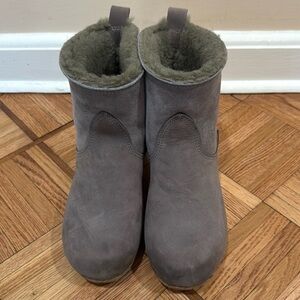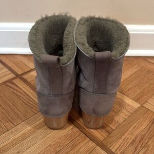 Fully lined lug sole shearling boot with nubuck toe, heel cap and back tab. 5” tall shaft. Lacquered wood base. Smoke Suede is a cool gray with a slight violet undertone Slightly wider than our best selling Mid Heel shearling boots. We recommend sizing up one full size in this style.
