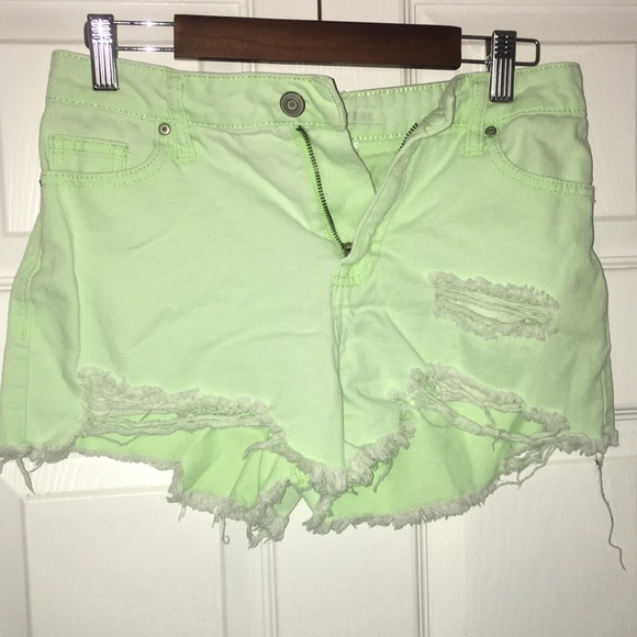 High rise distressed shorts. A pale highlighter lime green color.