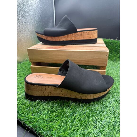 NoBo - Memory Foam- Platform Sandals- Cork/Black -Size 10W. Slip on style, with open toe, these chunky wedge platforms give a chic retro style to any outfit. Great condition, gently used, no marks or damage, cleaned and ready. Great value!!
