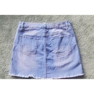 Beautiful light blue denim shirt with pink pinstripes and frayed hem line.