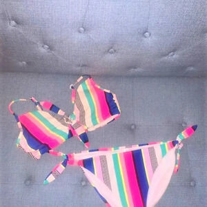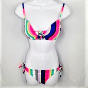 Rock those neon stripes! No Boundaries' Neon Stripe 2 piece bikini bathing suit ties at front (top) and sides (bottom).The brightly colored neon stripes are sure to add a pop to your swim collection.
