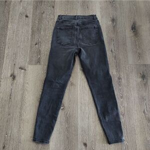 These sleek black high-rise jeans offer a modern fit with a flattering silhouette. The full-length design and smooth, even texture make them a versatile addition to any wardrobe. Perfect for a polished look, they provide comfort and style in one.