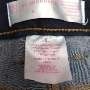No Boundaries dark wash denim skinny jeans in size 5 for juniors. These jeans feature a button and zipper closure, as well as pockets for added convenience. The fabric type is denim and the pattern is solid, with accents of the brand logo on the buttons and zipper. The jeans are perfect for any occasion and can be dressed up or down depending on your style. Don't miss out on adding these stylish and comfortable jeans to your wardrobe.