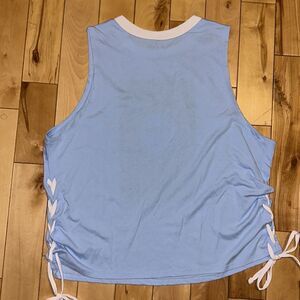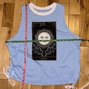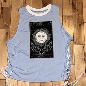 No Boundariex Juniors XXXL El Sol' Graphic Sleeveless Muscle Tank w/ Lace-up Slit Sides. Light blue w/astronomy graphic design
