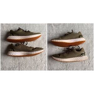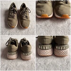 Great used condition. Ripstop Runner Sneaker by NoBull Project in Army Green, a muted green shade with white and tan detailing. Minimalist athleisure aesthetic, an athletic performance shoe perfect for crossfit, running and everyday training. Lace-up sneaker with one-piece ripstop upper and durable gum outsole with lug pattern that transitions from the gym to road running surfaces, see video. Reflective laces and branding. Note: light wear with minor streetwear/discoloration to bottom sole, minor marking and creasing to upper, and fabric rubbing/hole at interior heel, see photos. Original insoles have been replaced; faint discoloration/fading to insoles, see photos. Women's size 10, men's size 8.5, see photos for measurements.