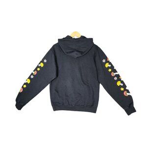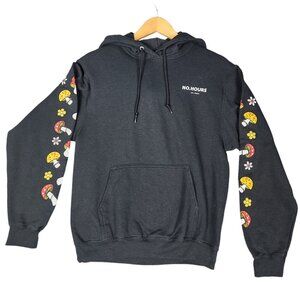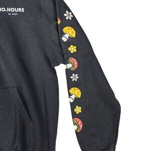 Stylish and comfortable black hoodie featuring fun mushroom and flower graphics on the sleeves. Ideal for casual wear and layering.