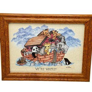 This framed art set illustrates whimsical Noah's Ark-themed scenes with humor and charm. Crafted in 1993 by Debbie Yarckley, these pieces are great for collectors or themed decor.