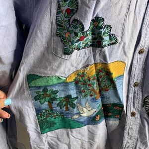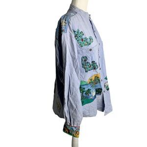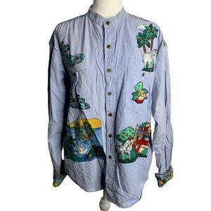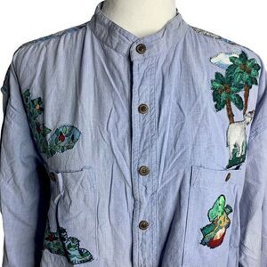 Noahs Arc Appliqued Chambray Shirt XL Blue Button Down Mandarin Collar Pockets