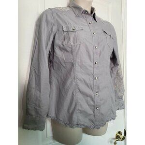 Noble Outfitters Large Western Snap Button Up Rodeo Shirt. Light Grey Equestrian Raw Hem. 2 Front Pockets 20 in. Chest 30 in Length