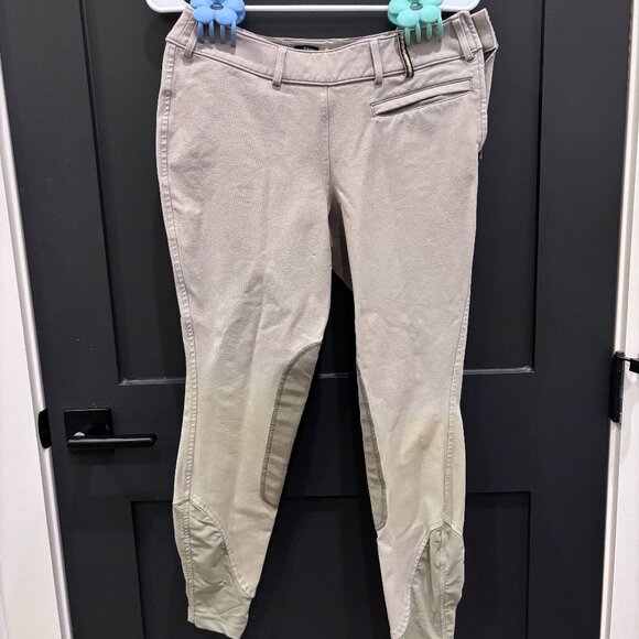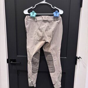 These professional yet comfortable pants are perfect for any huntseat/jumper show. The lovely knee patch helps with tackiness. They have been worn a couple of times, as shown by the light leather oil stain. They are size 26/R and fit true to size.