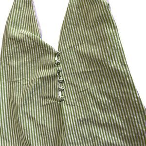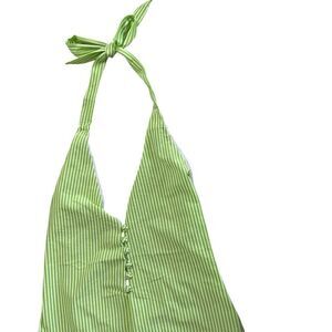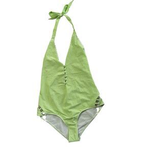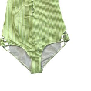 Step into chic vacation vibes with this brand new with tags Noblesse Oblige one-piece swimsuit. Features a fresh lime green and white vertical stripe pattern, plunging V-neckline with button detail, halter tie neck, and side cutout strap accents for a flattering, modern silhouette. Fully lined with soft stretch fabric for comfort and a sleek fit.