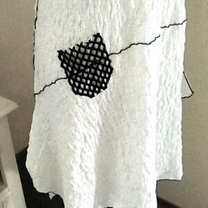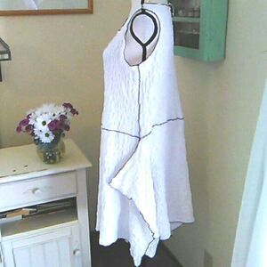 Made in the USA. Soft, deeply textured cotton blend fabric. Trimmed the black stitching. Handkerchief hem. Net patch pocket. Size S/8 measures 40 at chest, 38 at waist, 60 at hips, 36-44 long from shoulder to hem. Cool and different.
