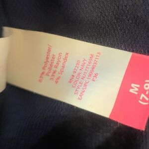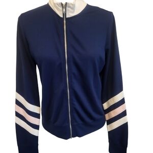 Nobo zip up light jacket with collard neck, very light weight could be used as active or casual wear. chevron sleeve design in white and light pink with navy blue body. women's size medium