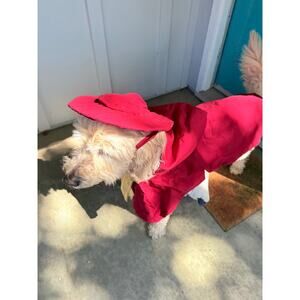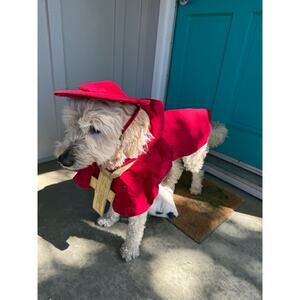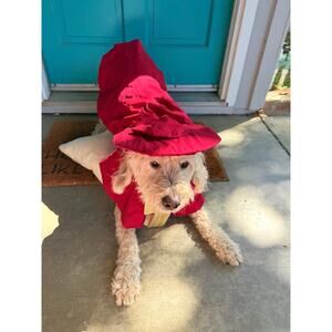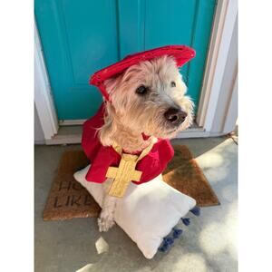 Pictured here on my 31 pound bestie, Ranger. The costume is handmade and imperfect, the rim of the hat is especially rough. But, taken together, the impression of the hat, cassock, and gold "cross necklace" is diabolical. You can take the deadly soft cushion, too, if you dare.