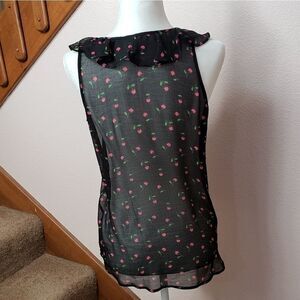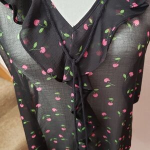 V neck front with ruffle and pom pom ties. Ruffles goes down the front