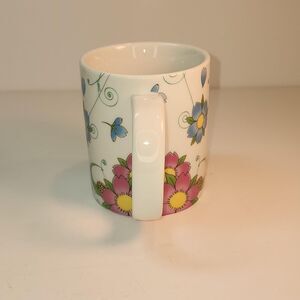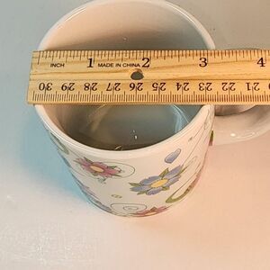 Cherry Lane by Colorblok mug with pink, blue, yellow, green floral design. dishwasher and microwave safe. made in China. cute design. preowned, good condition, no chips or wear. measuring 3.25 in wide st mug opening and approximately 3.75 in tall.
